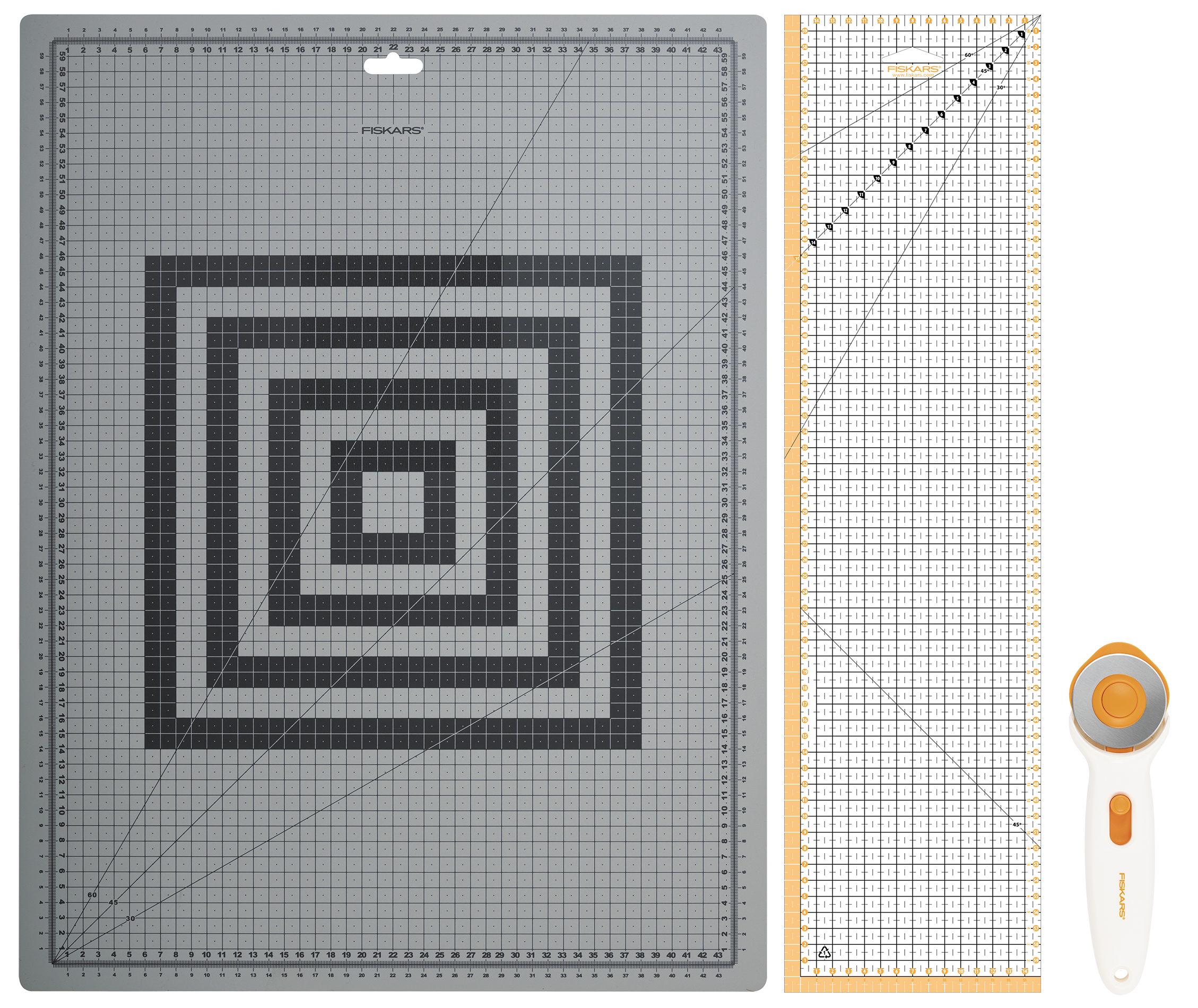 - A Fiskars varrási kezdőkészlet egy forgóvágót, vágószőnyeget és varróvonalzót tartalmaz.